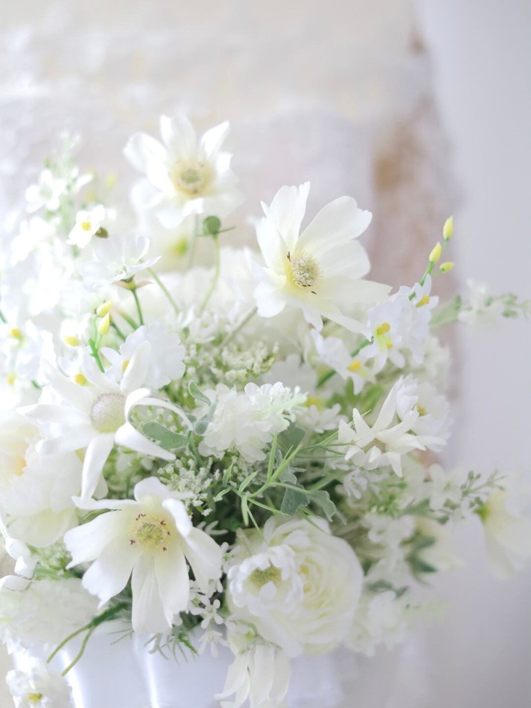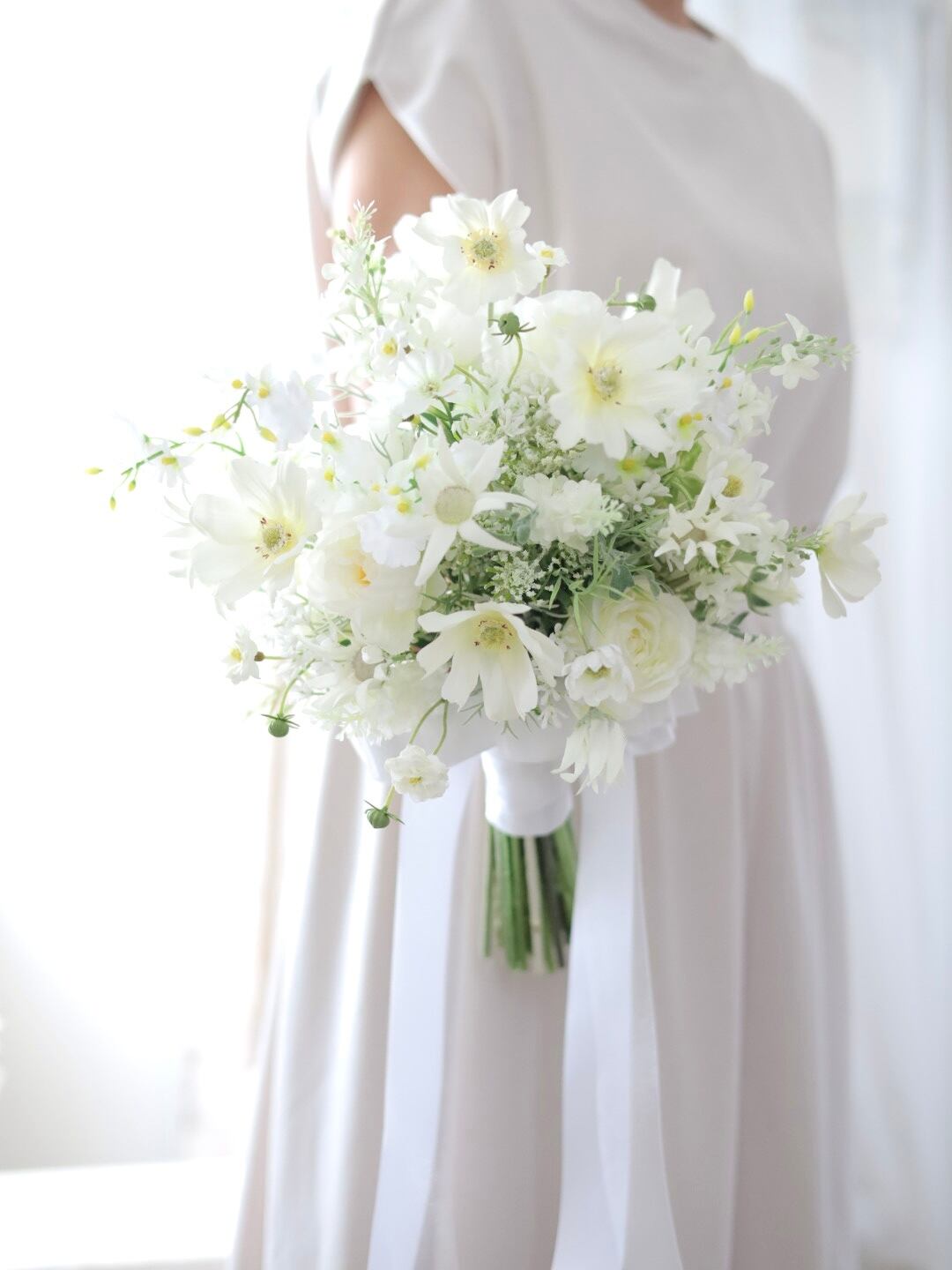 白いコスモスを主役に束ねた