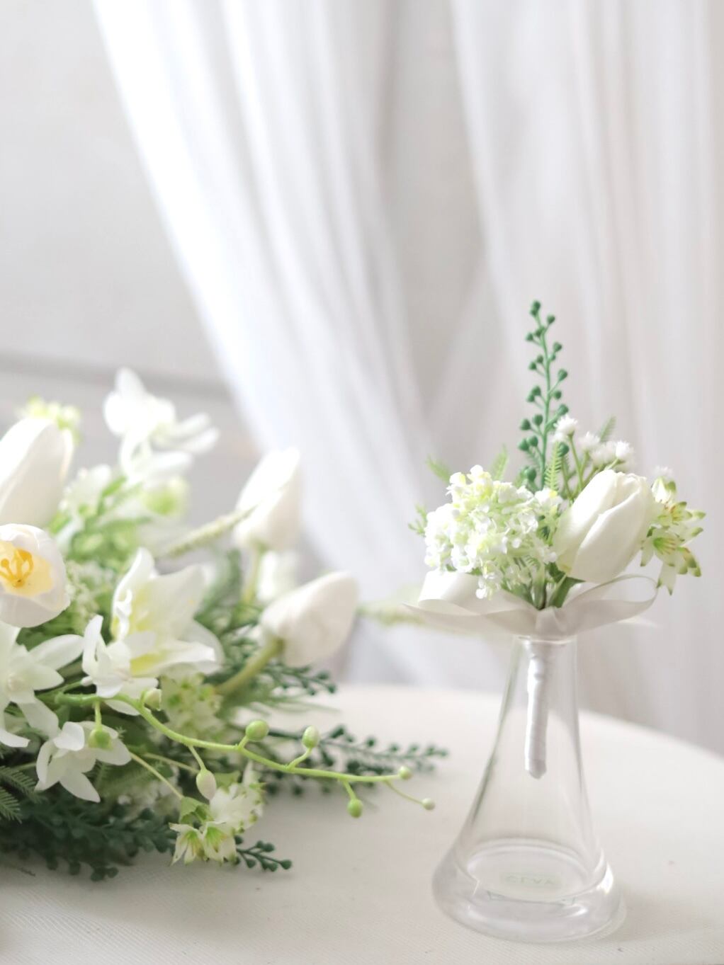 白チューリップとグリーンブーケ ブートニアセット ウェディングブーケ ブートニアセット