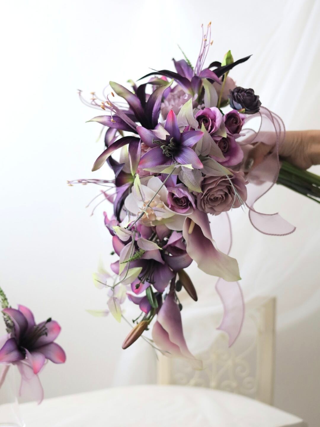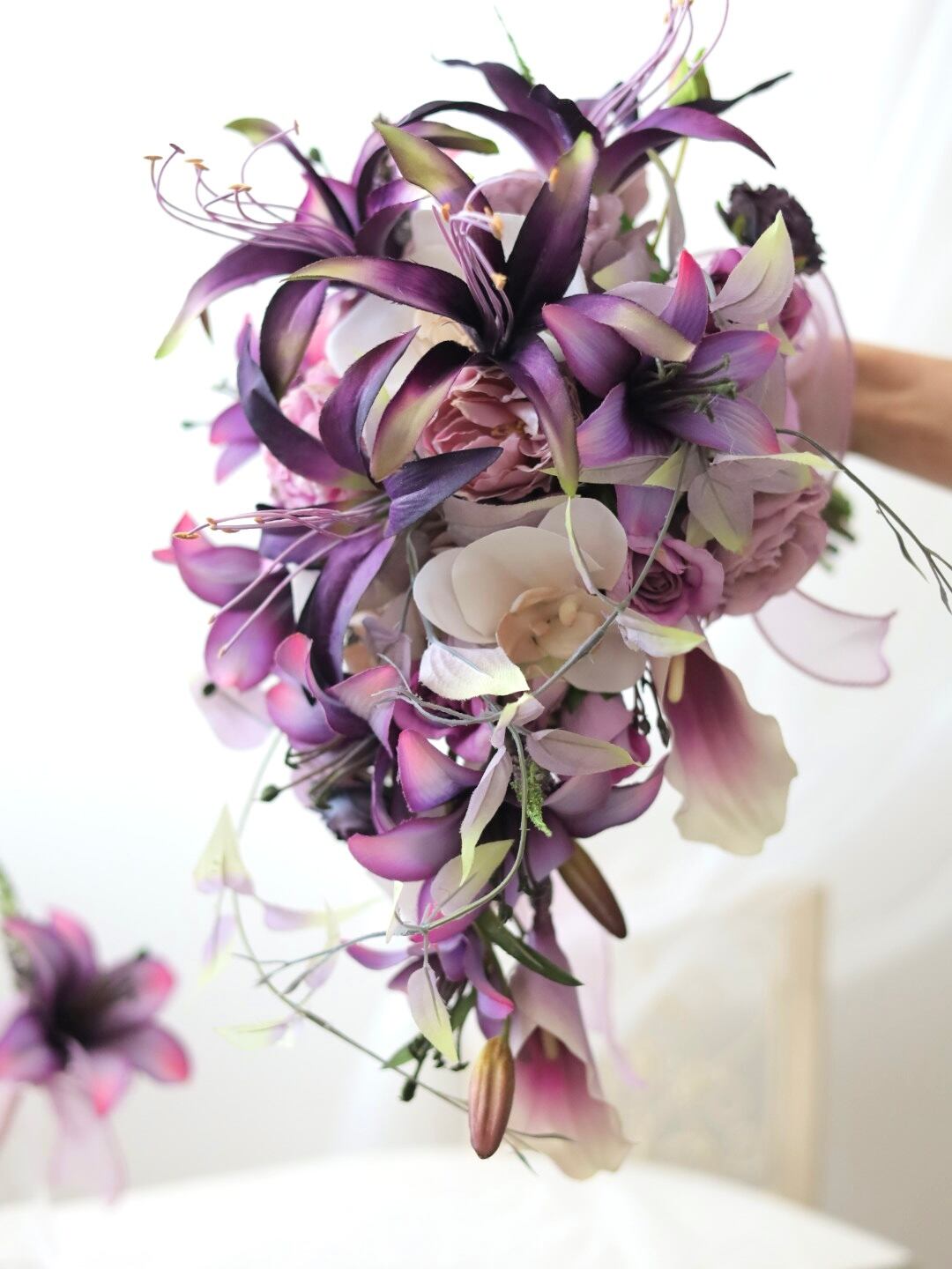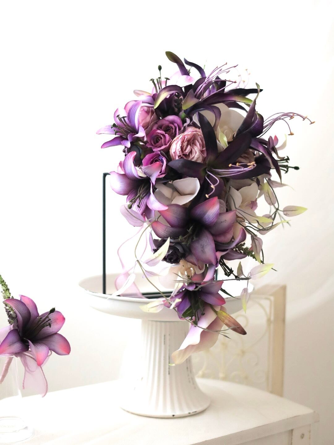 胡蝶蘭×リリィのパープル キャスケードブーケ ブートニアセット 前撮り 紫ブーケ