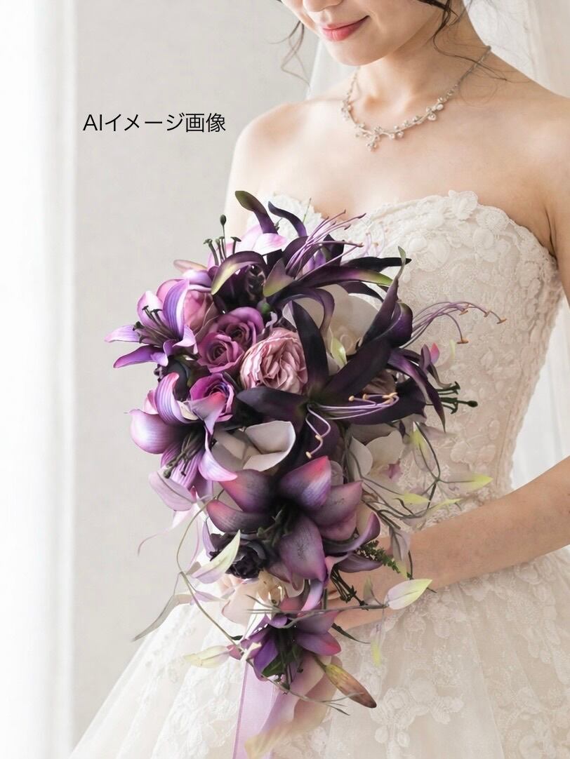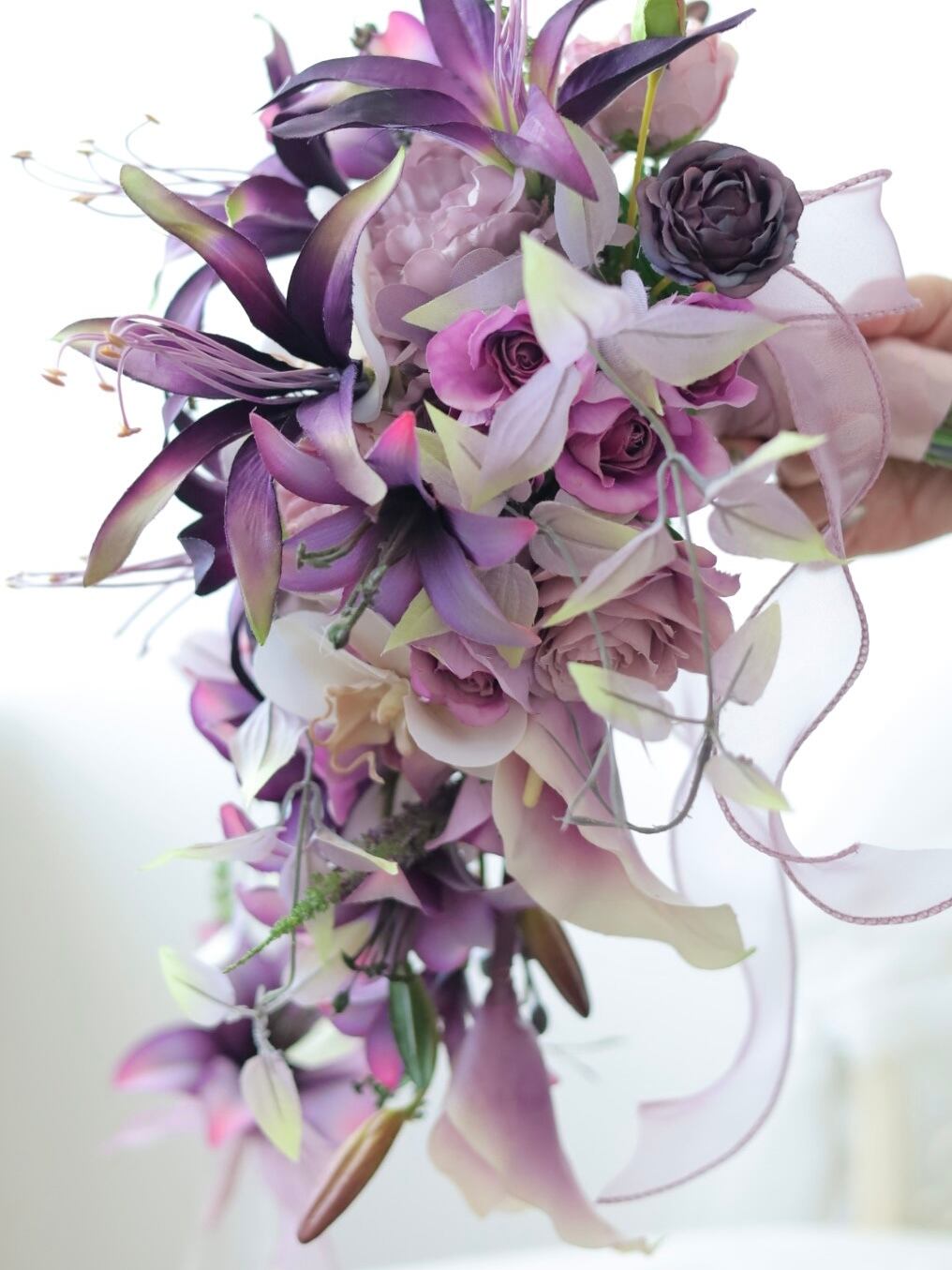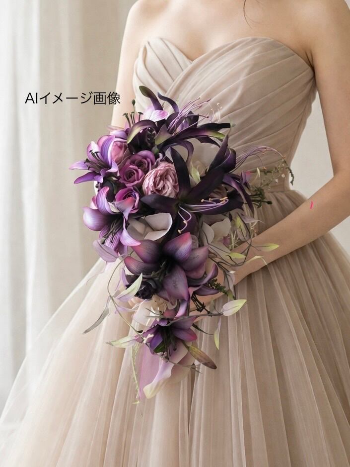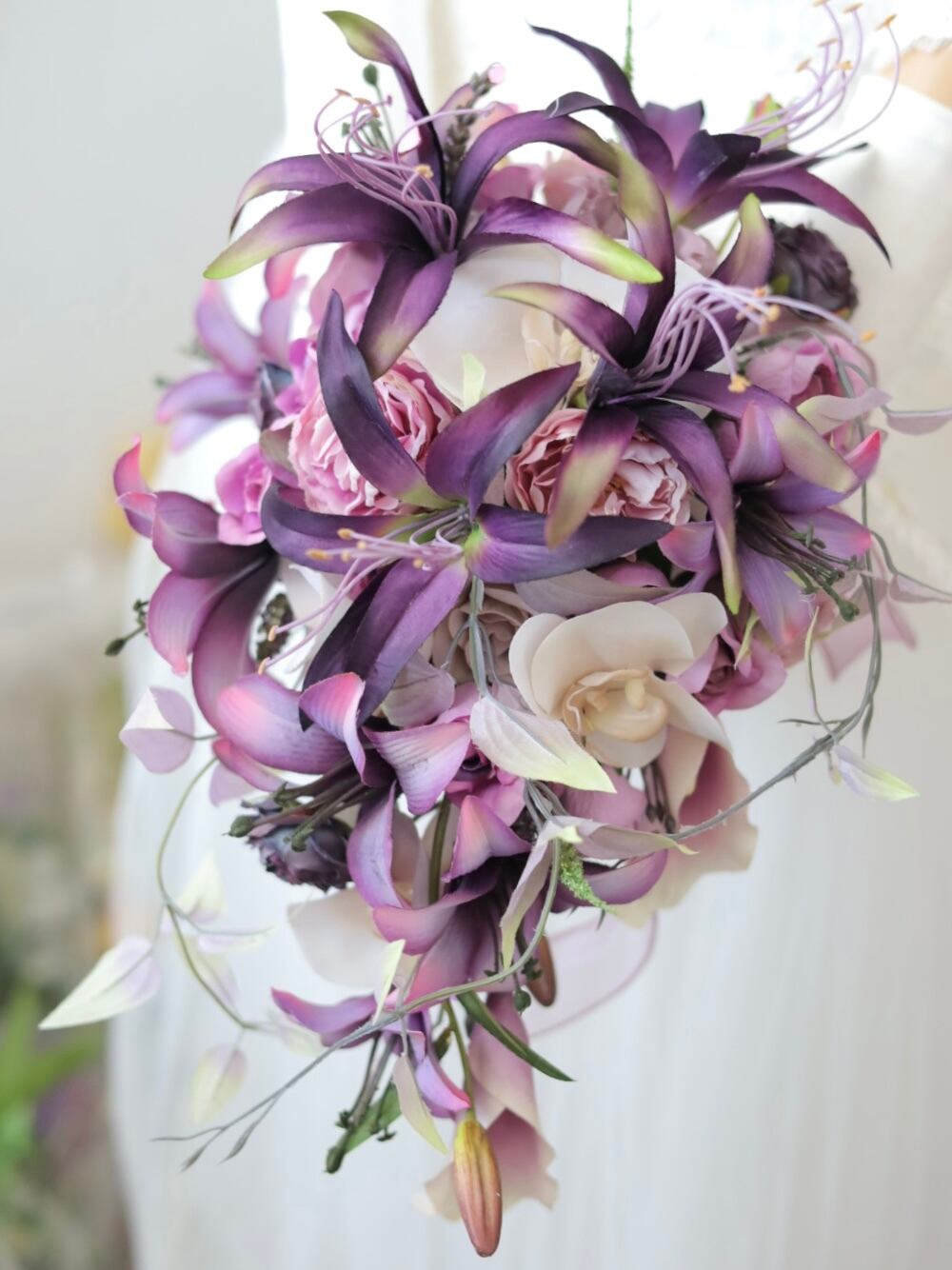 胡蝶蘭×リリィのパープル キャスケードブーケ ブートニアセット 前撮り 紫ブーケ