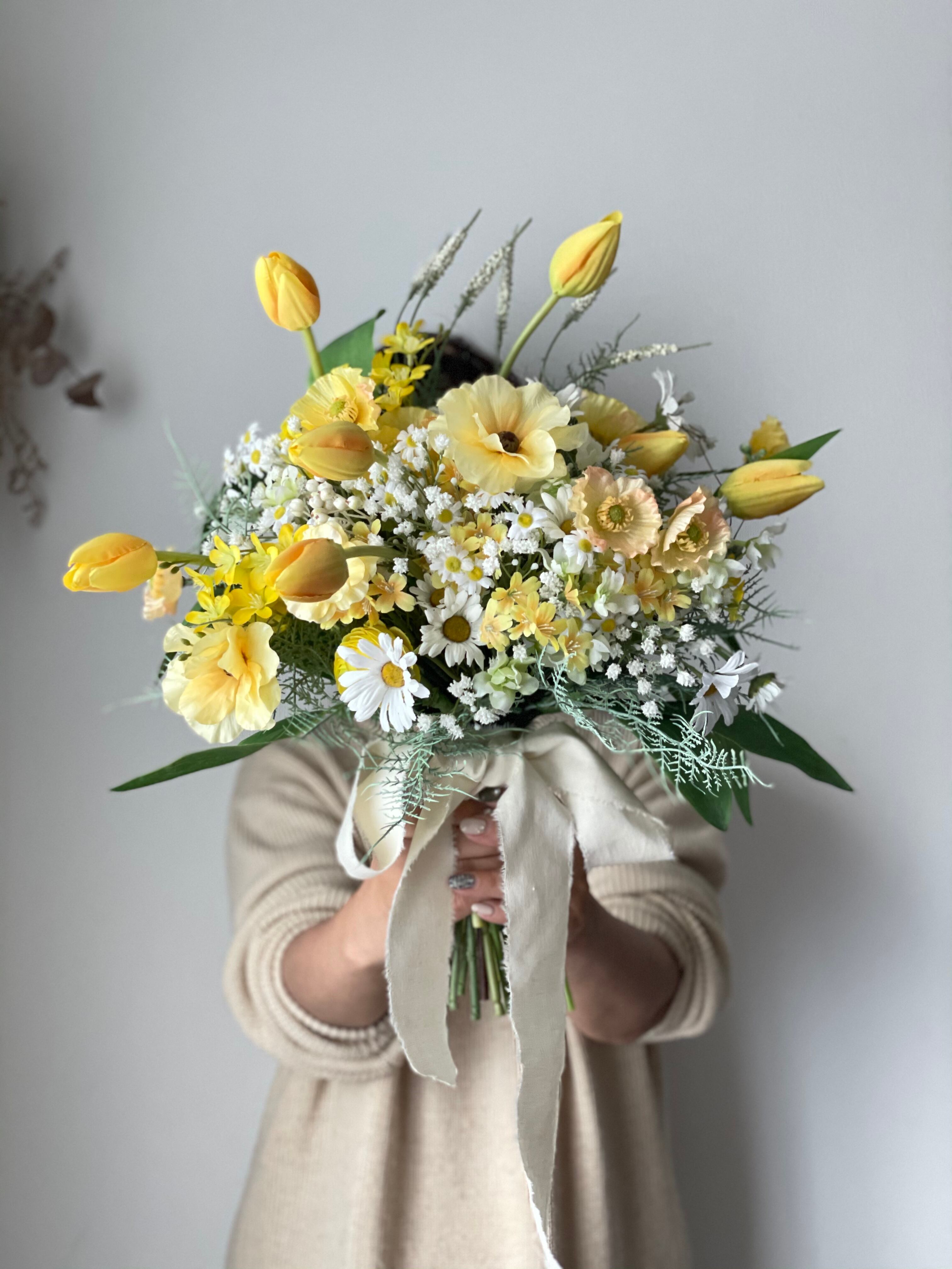 元気いっぱい春をイメージして、黄色のチューリップをメインに束ねました。