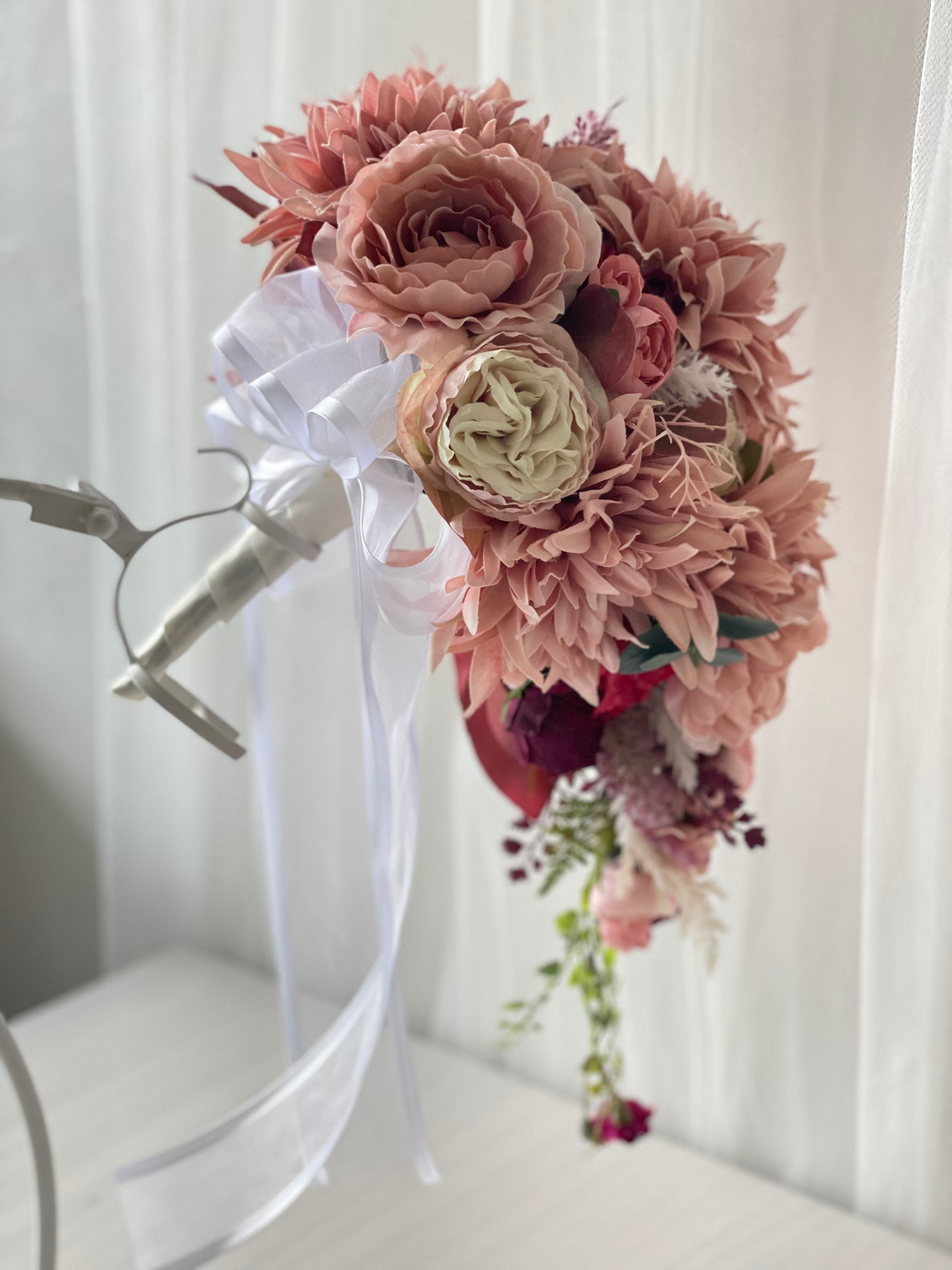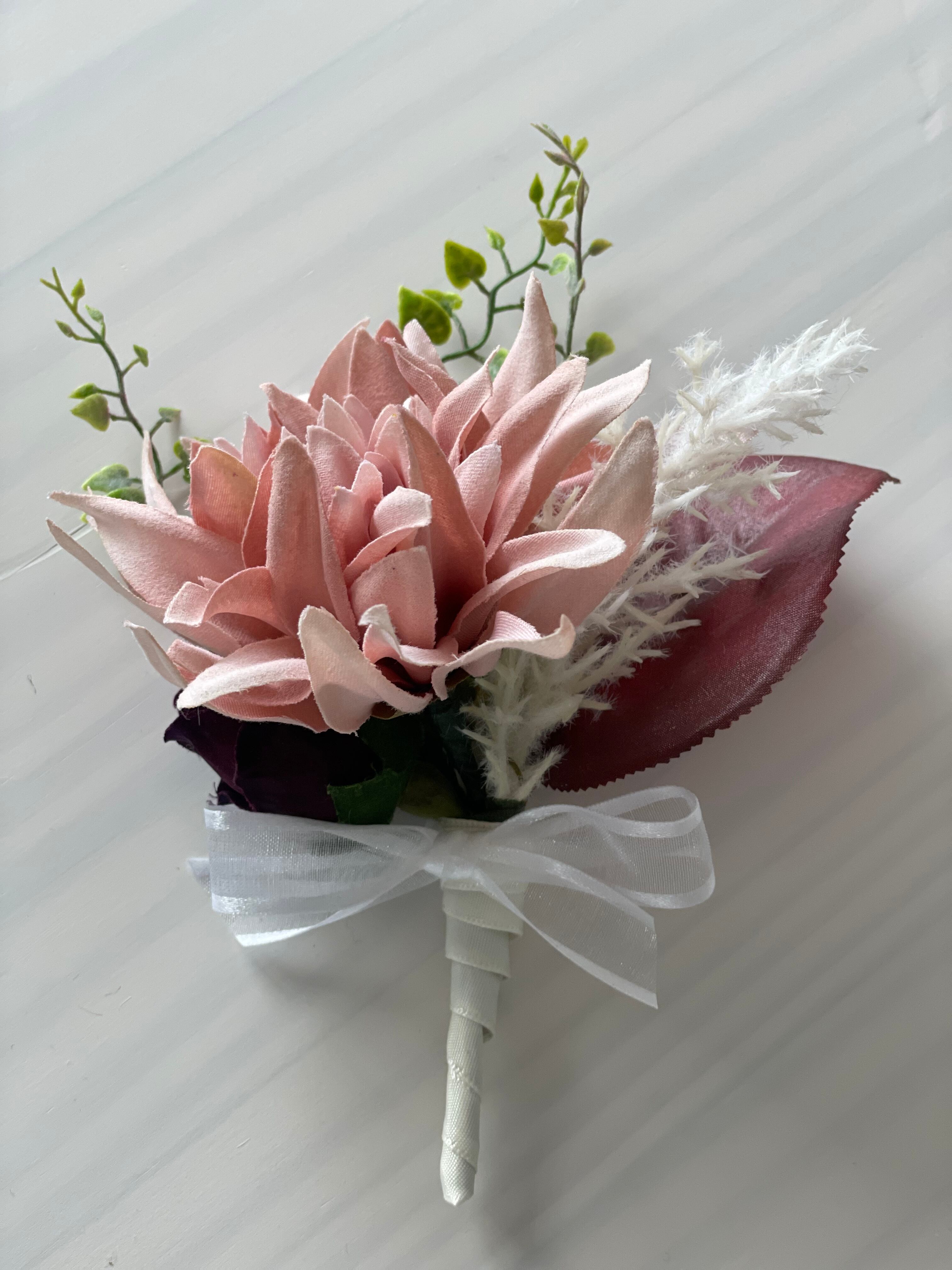 ピンクダリアキャスケードブーケ ブートニア2点セット