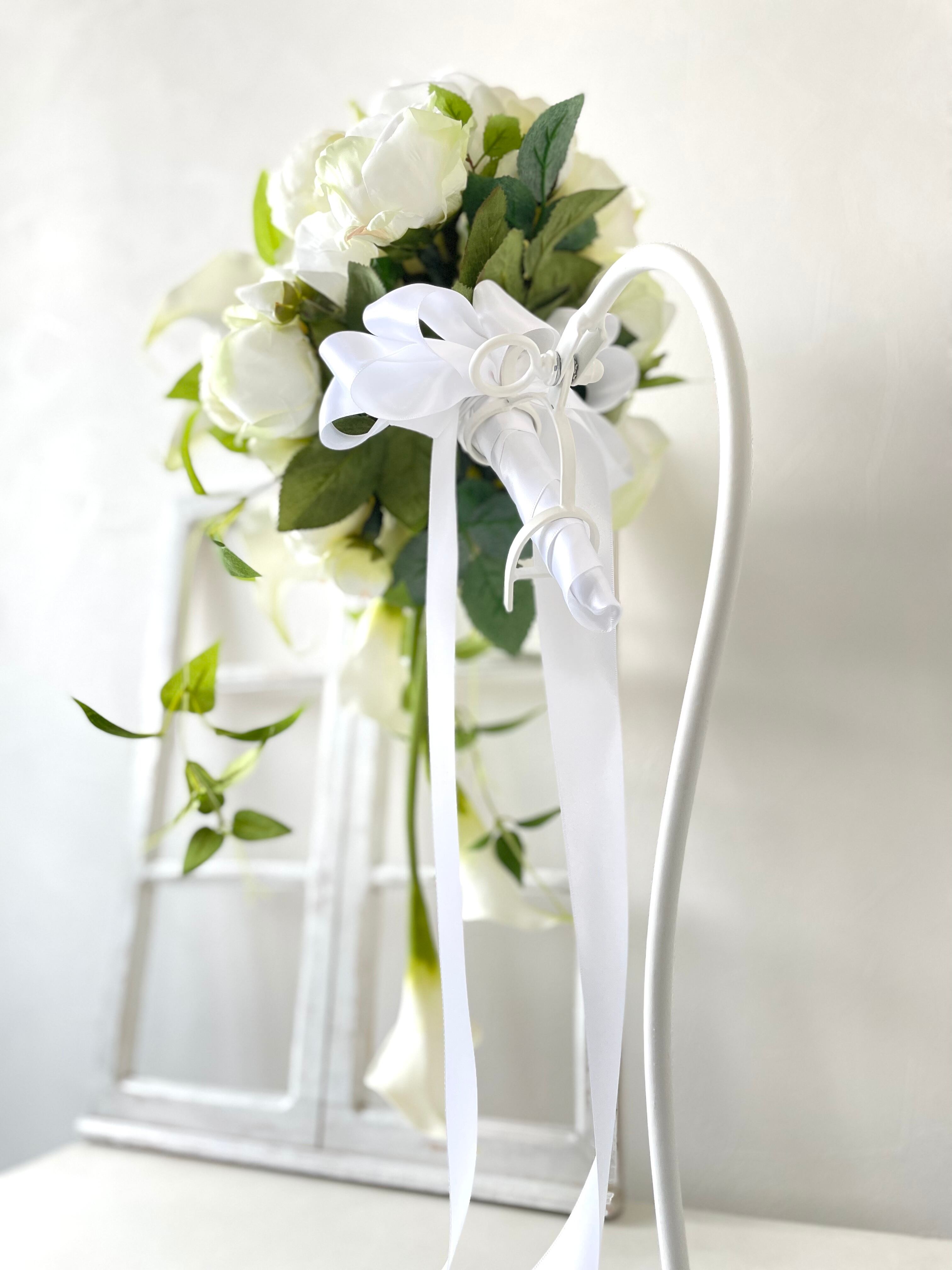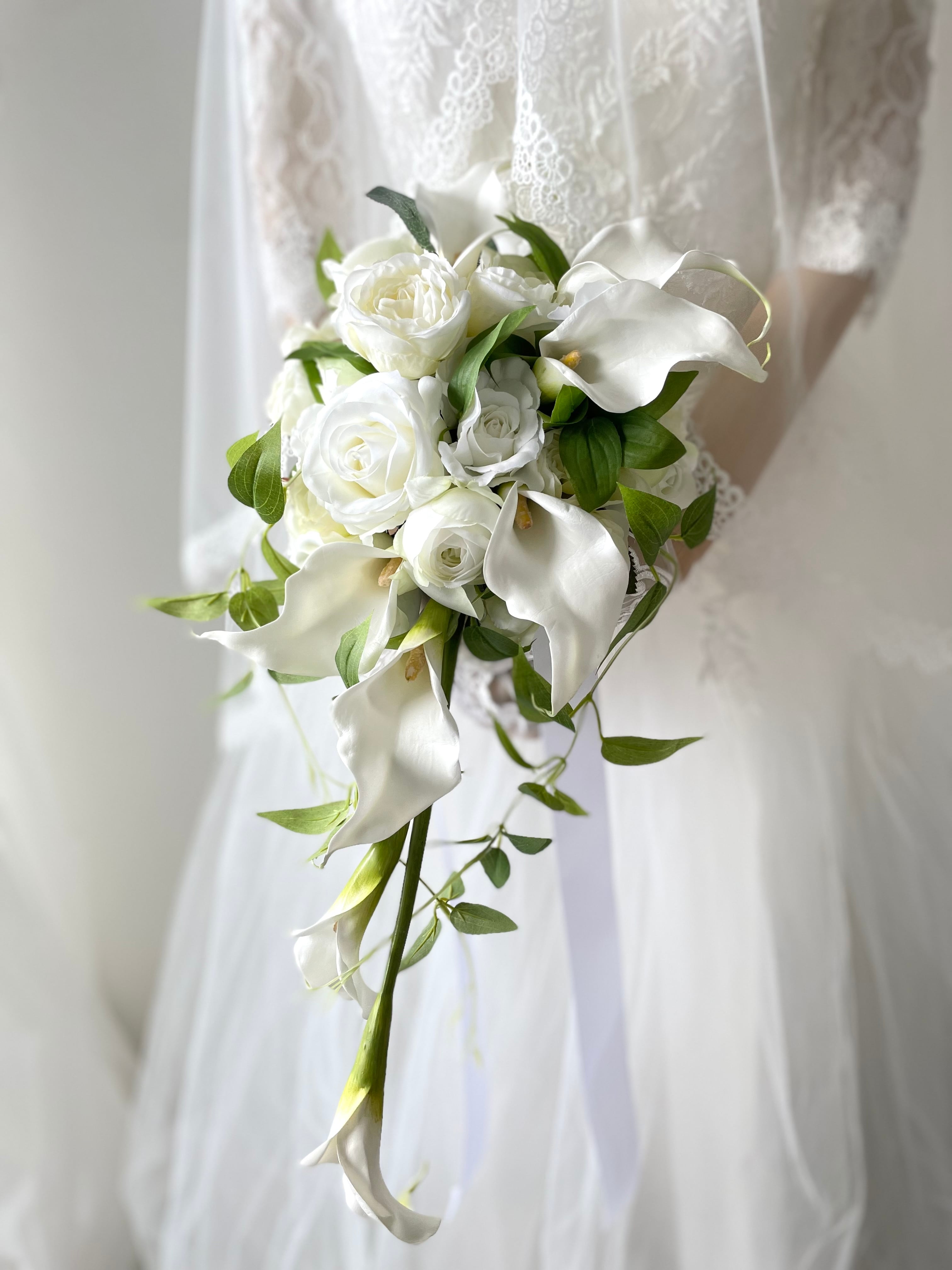 カラーと薔薇のクラシックキャスケードブーケ ブートニアセット ウェディングブーケ