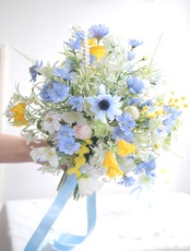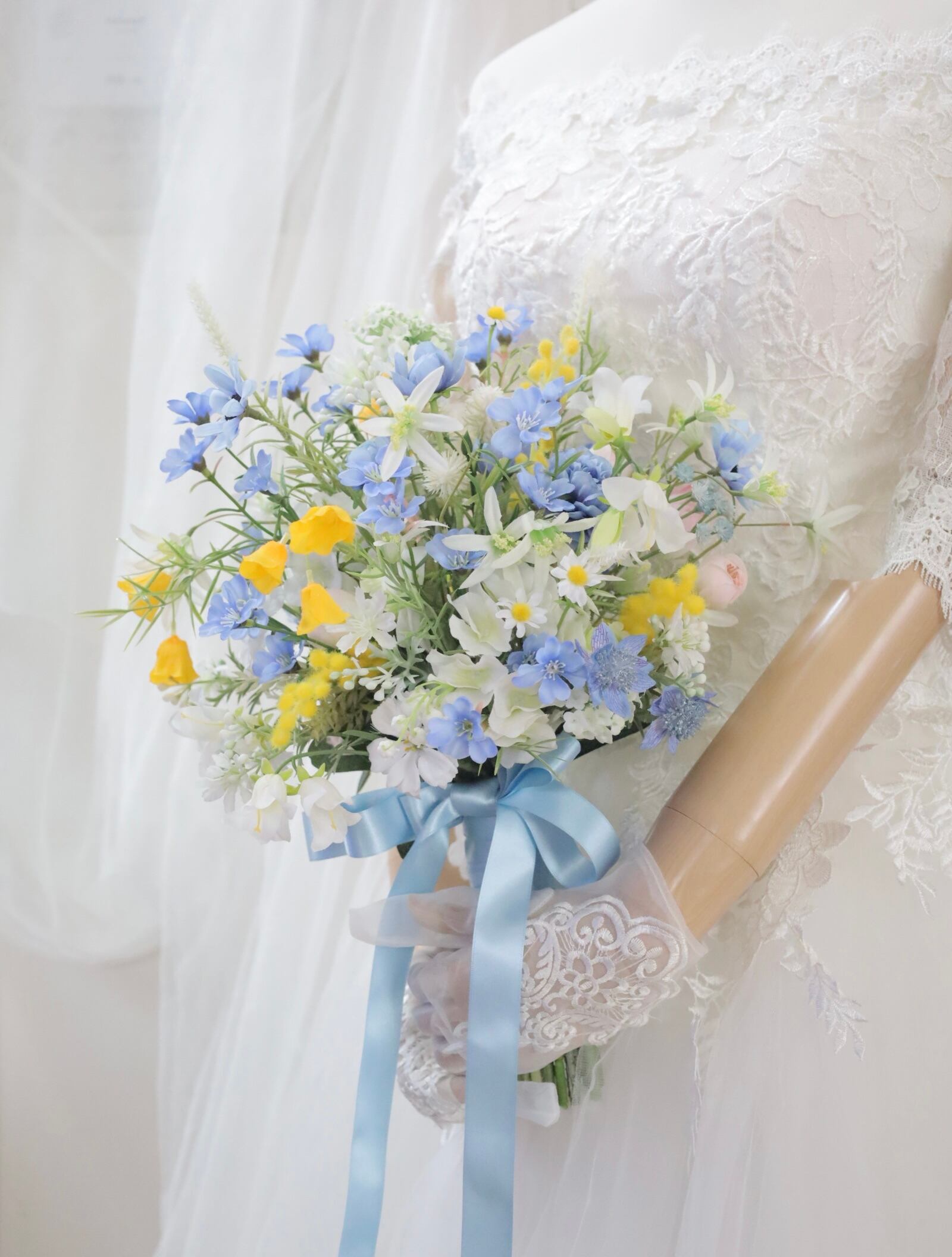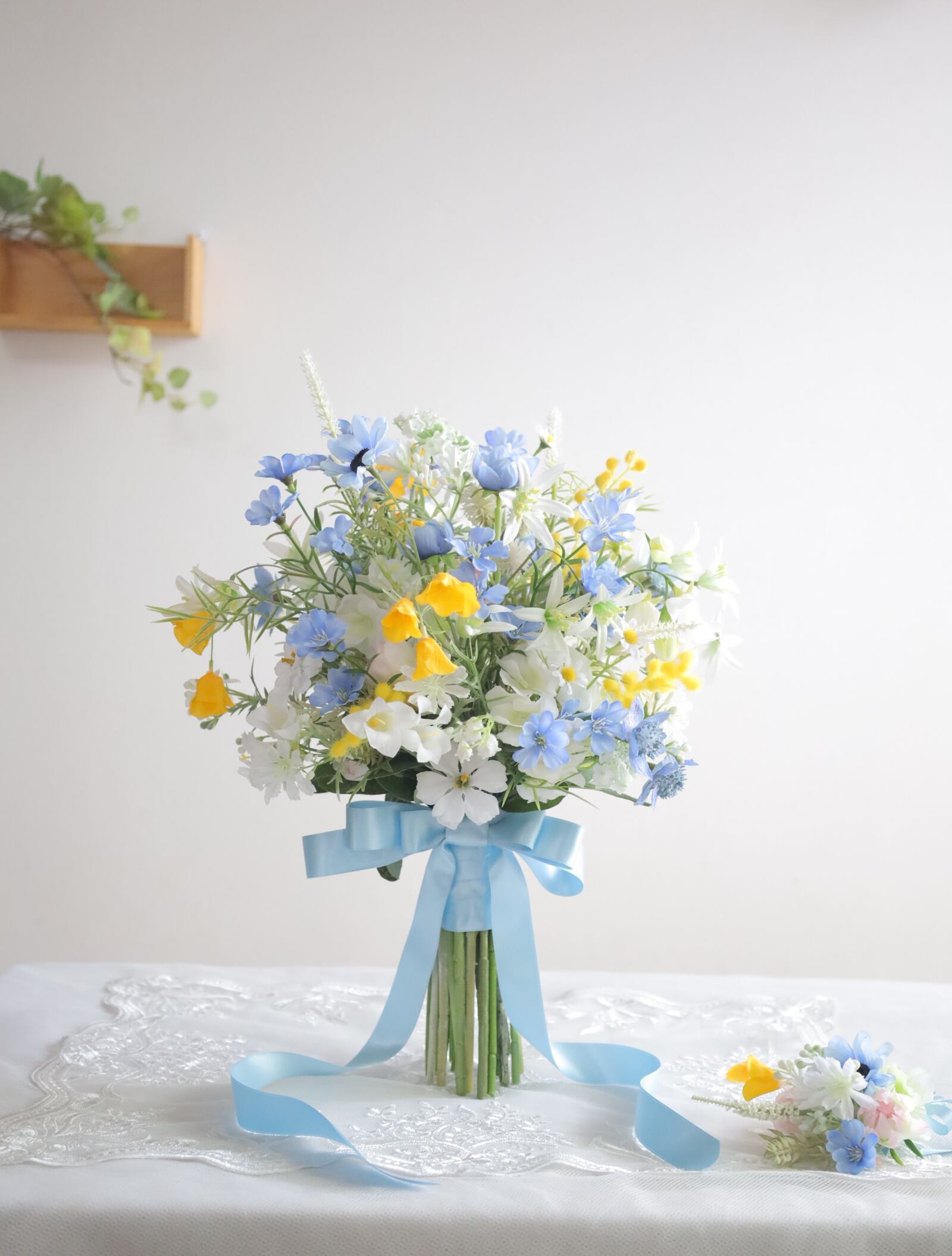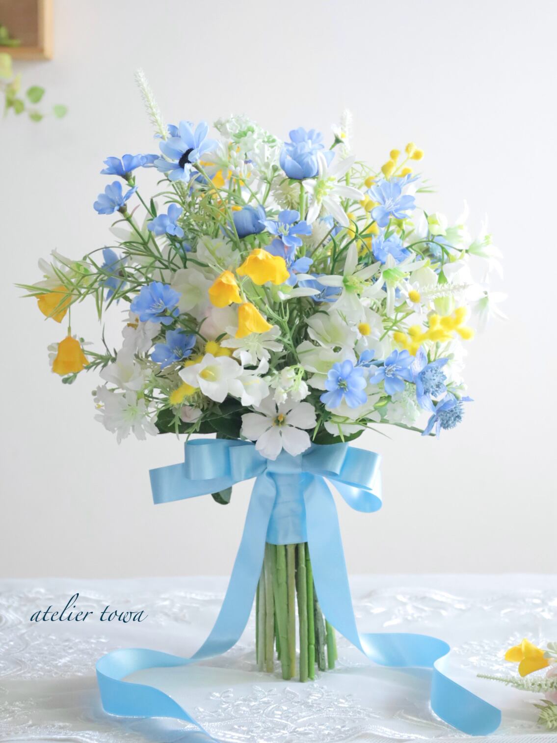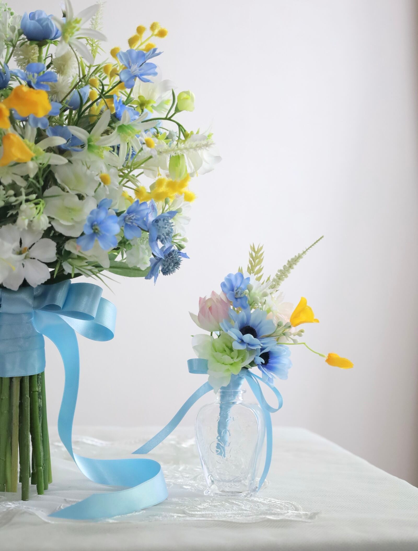 爽やかブルーナチュラルブーケ ウェディングブーケ ブートニアセット